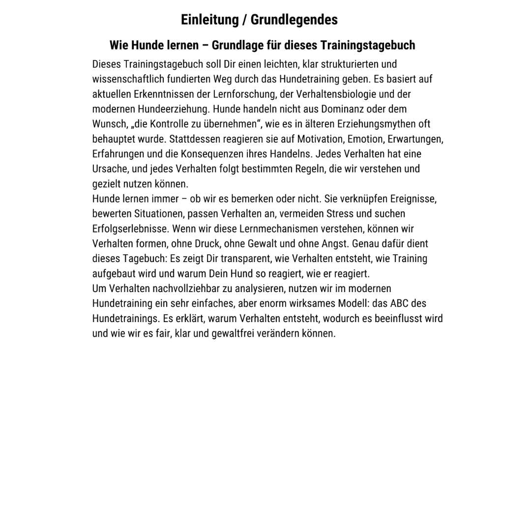 Das Tagebuch enthält strukturierte Bereiche für eigene Notizen, Trainingsprotokolle, Zielplanung, Tagesvermerke und Fortschrittsdokumentation. Damit eignet es sich ideal für den langfristigen Trainingsaufbau, für die Begleitung von Verhaltensänderungen, für die Selbstreflexion und für jedes Training, das transparent, nachvollziehbar und ruhig gestaltet werden soll. Die Leitfäden dienen als Orientierung, sind flexibel anpassbar und lassen bewusst Raum, um Übungen individuell auf den eigenen Hund abzustimmen – immer frei von Angst, Druck oder Zwang.